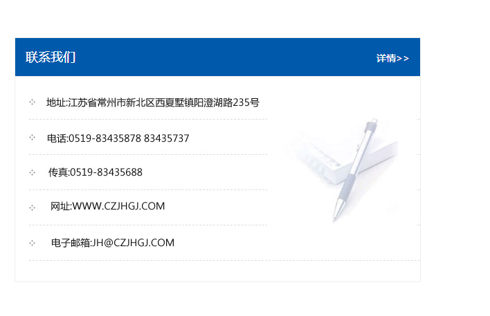 地址:常州市新北區友邦商務大廈1幢16、17層  電話:0519-85101652  傳真:0519-85112595  郵編:213022  網址:www.cz-jiayue_cn.jsxrep.com  郵箱:xiajifengaa@163.com